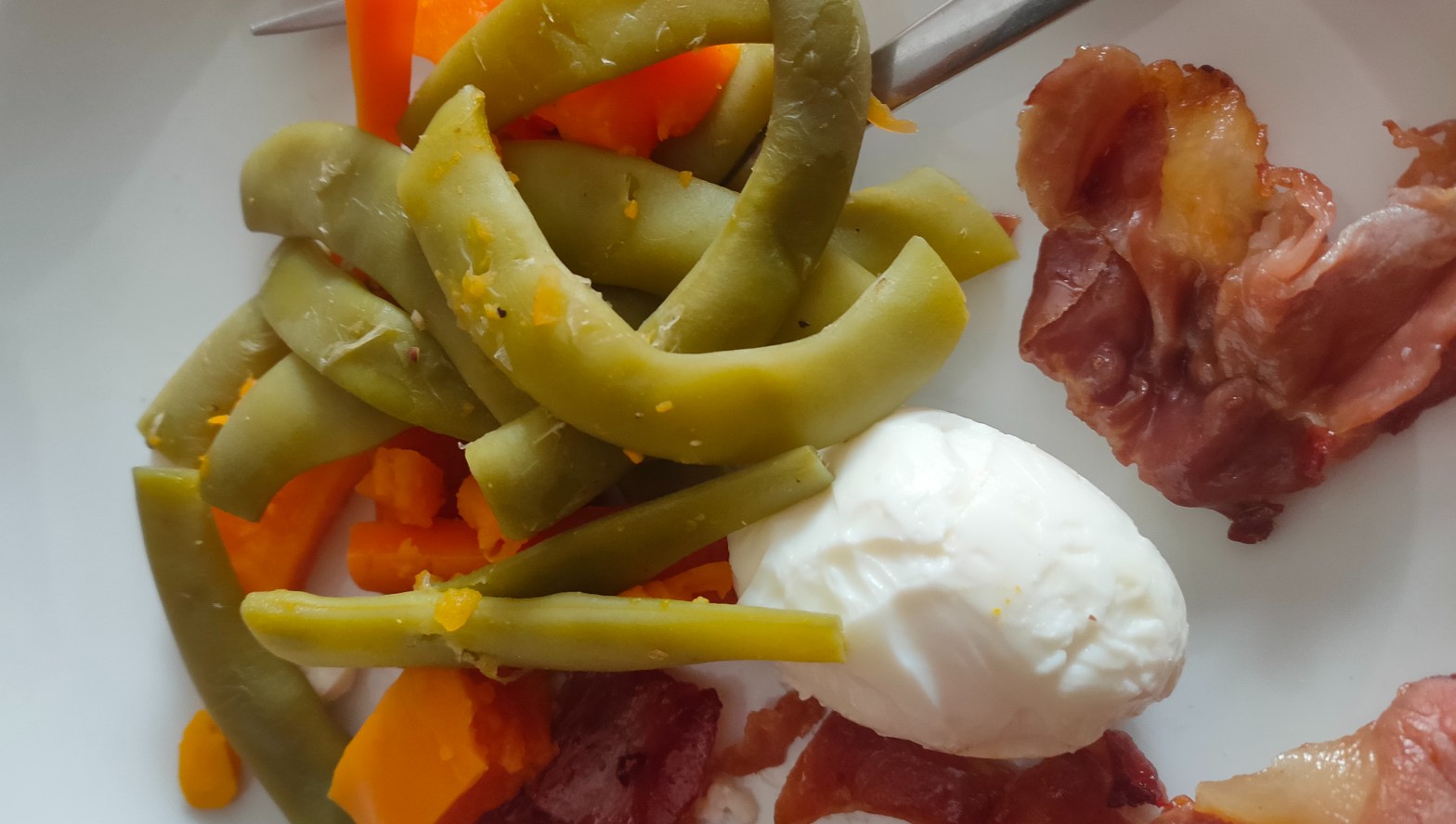 - Cando os ovos estean listos, pasámolos por auga fría para poder pelalos sen queimarnos e unha vez descascados, xuntámolos coas verduras no prato e botamos por riba o xamón co aceitiño que sobrase ou soltase a propia graxa do mesmo.