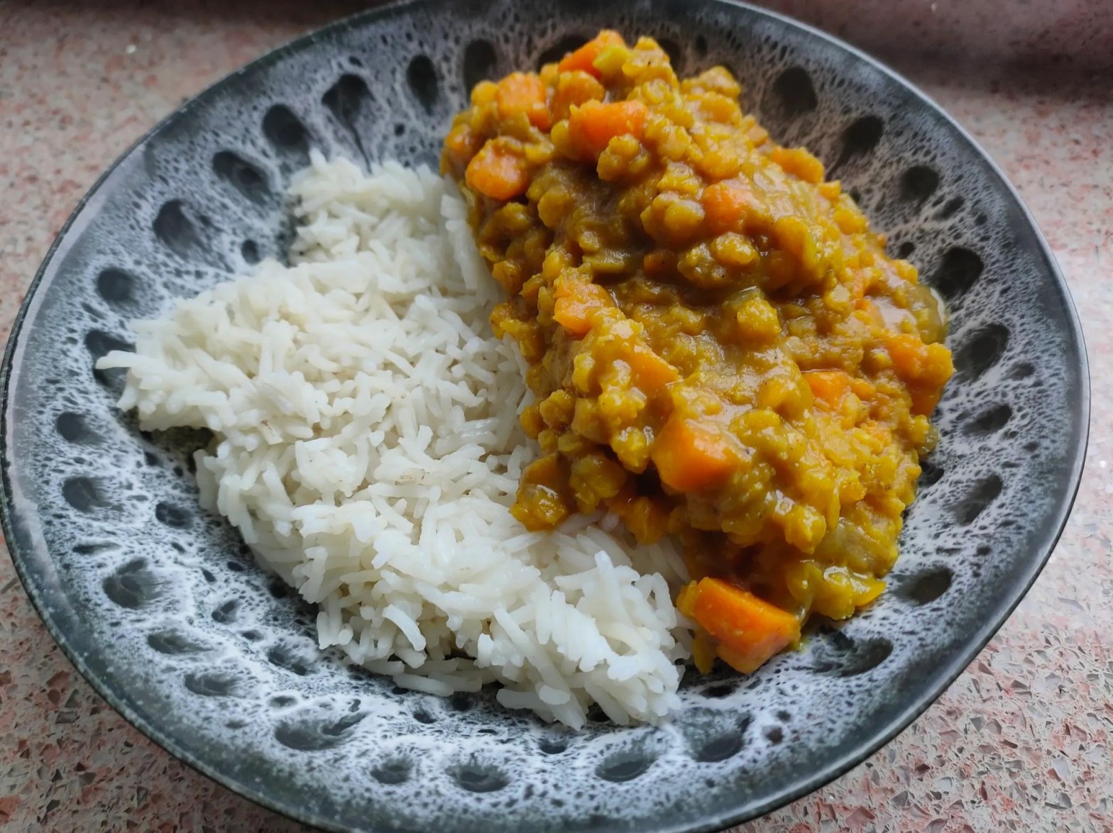 Este é un “Curry/Dahl de Lentellas Vermellas e Boniato“, o que pasa é que me quedaba o título moi longo, e decidín abrevialo. Segundo a autora, Dahl é o nome que se lle dá na cociña india aos pratos que se elaboran con legumes sen pel (que non requiren poñelas a remollo previamente). Ah, e é vegano e sinxeliño, marabilla!